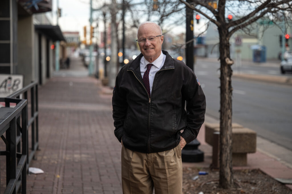 Aurora Mayor Mike Coffman stands on Colfax near the Fox Theatre on Thursday, Dec. 11, 2025. (Stephen Swofford, Denver Gazette)