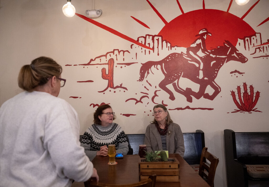 Heather Adams, owner of Vanishing West Ciders, left, delivers two glasses of cider to customers, Windy Clement, center, and her sister, Linda Clement, right, at Vanishing West Ciders on Colfax Avenue in Aurora on December 10, 2025. (Michael G. Seamans, Denver Gazette)