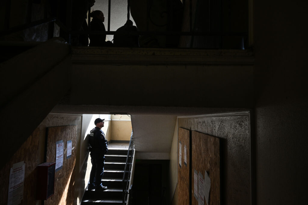 Police and members of the media stand in the hallway between apartments as Aurora Police Chief Todd Chamberlain announces the closure of The Edge of Lowry Apartment complex in Aurora on Wednesday, Feb. 19, 2025. The move marked the second shutdown of a troubled apartment complex owned and operated by CBZ Management that became the focal point of America’s debate on illegal immigration, particularly after the reach of a Venezuelan prison gang into Colorado cities like Aurora and Denver came to light. (Stephen Swofford, Denver Gazette)
