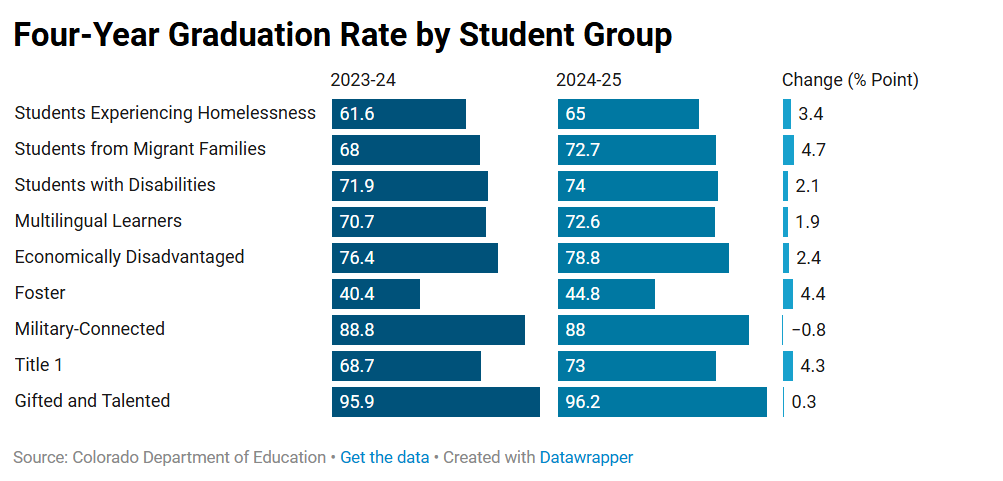 “Colorado’s graduation and dropout data show encouraging progress, with more students earning their diplomas and fewer leaving school before graduation,” said Education Commissioner Susana Córdova in a statement. “We also have work to do to continue closing gaps for students of color, students with disabilities, students experiencing homelessness, economically disadvantaged students, and multilingual learners.