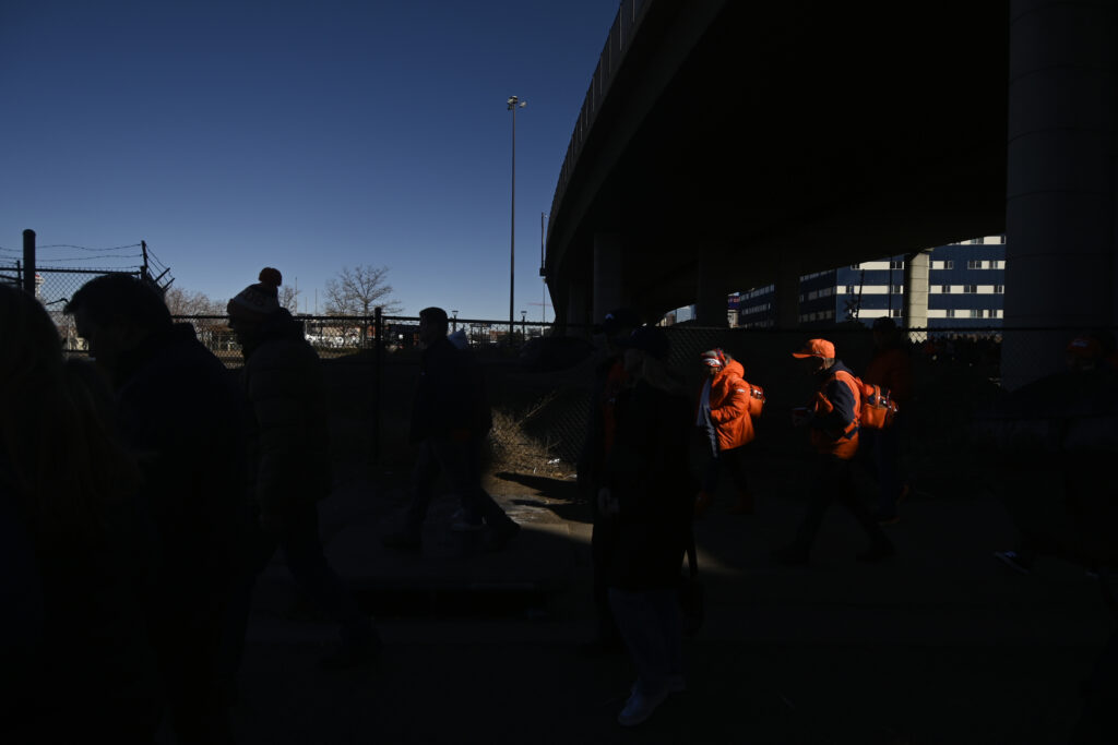 (Stephen Swofford, Denver Gazette)Broncos fans make their way from the light rail to Empower Field before the start of the Broncos vs Bills playoff game on Saturday, Jan. 17, 2026.