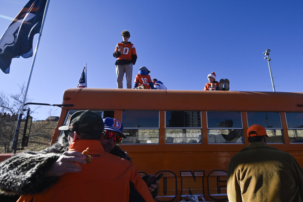 (Stephen Swofford, Denver Gazette)Kids sit on top of the Broncos Bus as their families tailgate outside Empower Field before the start of the Broncos vs Bills playoff game on Saturday, Jan. 17, 2026.