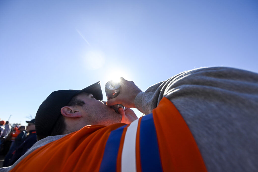 (Stephen Swofford, Denver Gazette)Garrett Kauppila shotguns a beer as he waits in line to enter Empower Field before the start of the Broncos vs Bills playoff game on Saturday, Jan. 17, 2026.