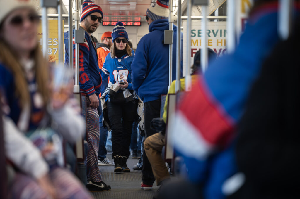 (Stephen Swofford, Denver Gazette)Bills and Broncos fans make their way to Empower Field on the light rail before the start of the Broncos vs Bills playoff game on Saturday, Jan. 17, 2026.