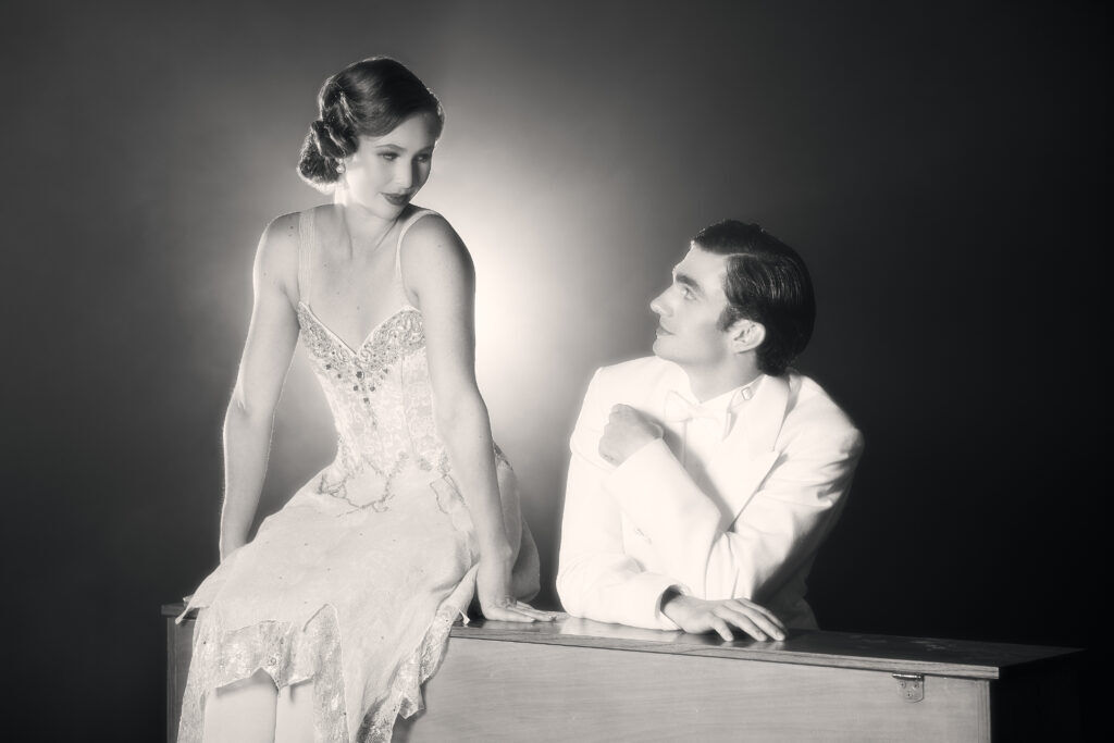 Davis’ score bubbled with re-creations of jazzy dance music in those party sequences. The central characters are clearly drawn: Liam Hogan presented a tall, strapping Gatsby, unable to hide his passion for his ex-lover Daisy, portrayed by a softly danced Jennifer Grace. Her husky husband, Tom, became the bad guy by a scowling Christopher Moulton, his jealous temper adding visible tension. Leah McFadden as sassy Myrtle, emerged as a likable character, as did Jonnathan Ramirez’s Nick. Catherine McGregor’s Jordan, Daisy’s trusted companion, also had her warm, intimate moments. All were backed by a busy supporting cast of waiters, maids and flapper girls. There was also a stuffed pet dog — auditions for the real canine were being held in an adjacent room.