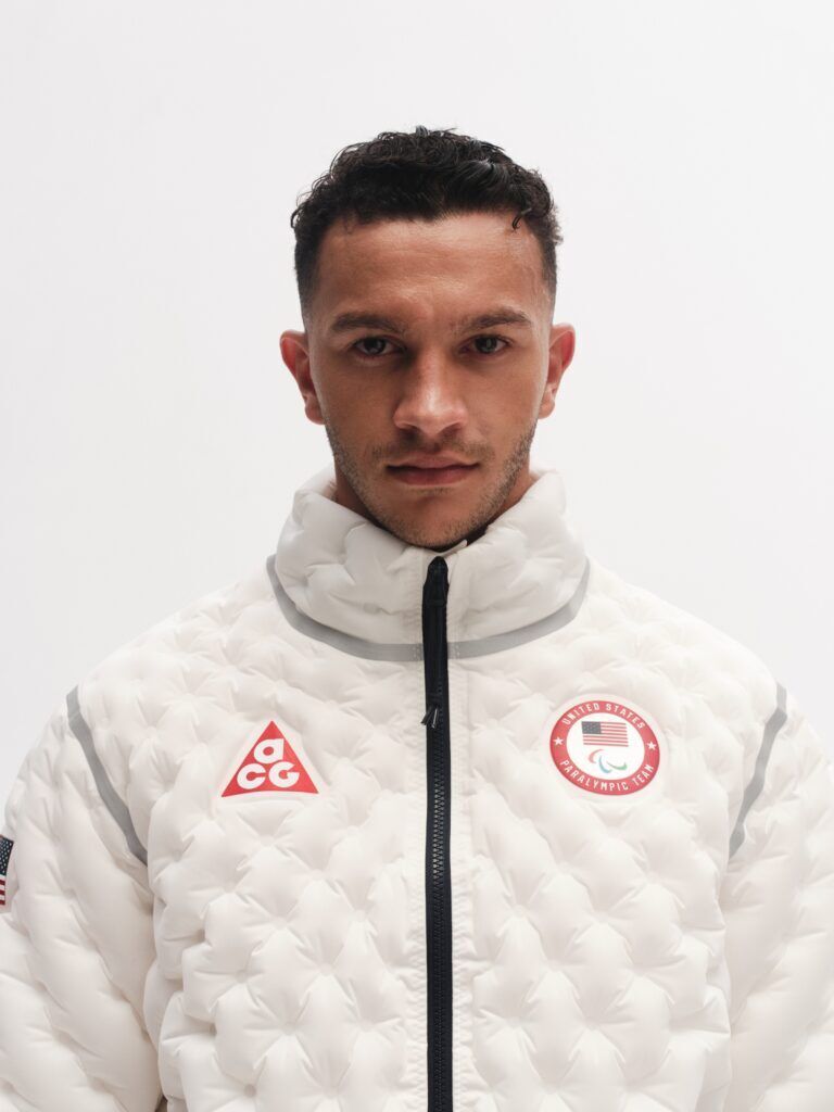 The white jacket that will be worn on the podium features dynamic warmth and personalized thermal control for athletes in all conditions. It allows athletes to regulate their temperature “without changing layers by inflating or deflating air within the jacket’s baffles, offering warmth levels that range from a lightweight hoodie to a mid-weight puffer.”