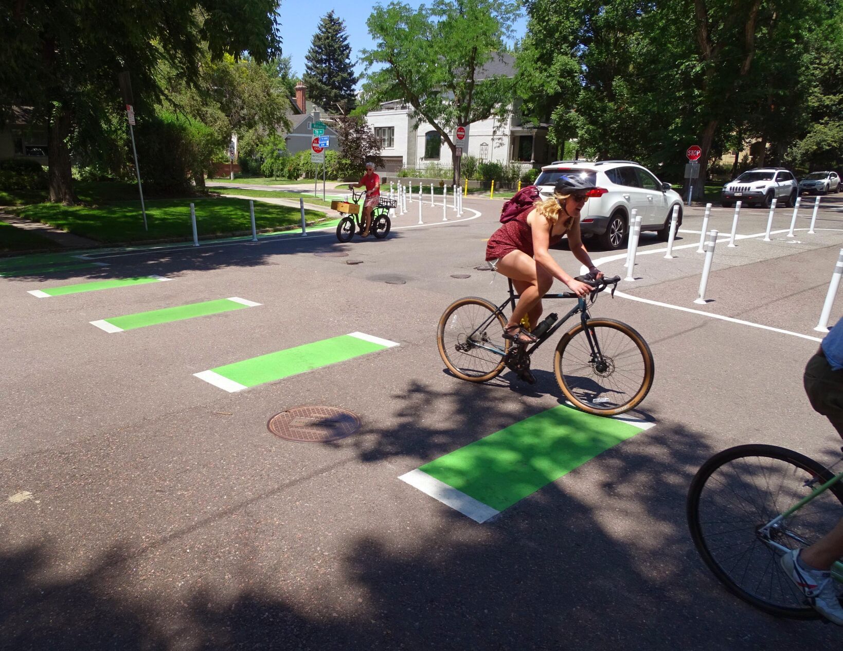 Other deployments on quieter streets included West 29th Avenue between Speer and Sheridan boulevards, one of a few commuter streets connecting western suburban areas to downtown. There, along a residential 2-mile stretch, the city replaced street parking on both sides with bike lanes lined by bollards and striped barriers.