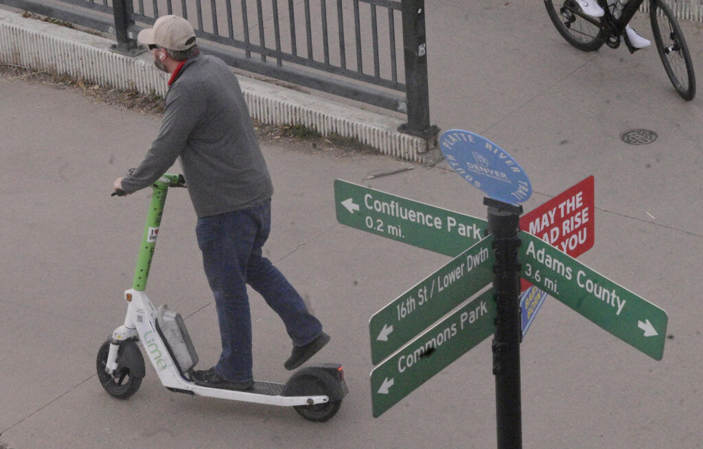 Denver’s city ordinance makes it unlawful to ride a bicycle or electric scooter on a sidewalk, with limited exceptions for city employees, newspaper delivery or sections designated as part of a bike route.