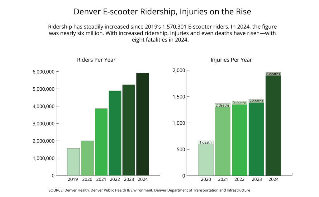 Fatal crashes remain a small fraction of Denver’s e-scooter rides, but are not anomalies. City data shows Denver typically records a handful of scooter-related deaths each year, but in 2024, that number spiked to eight.