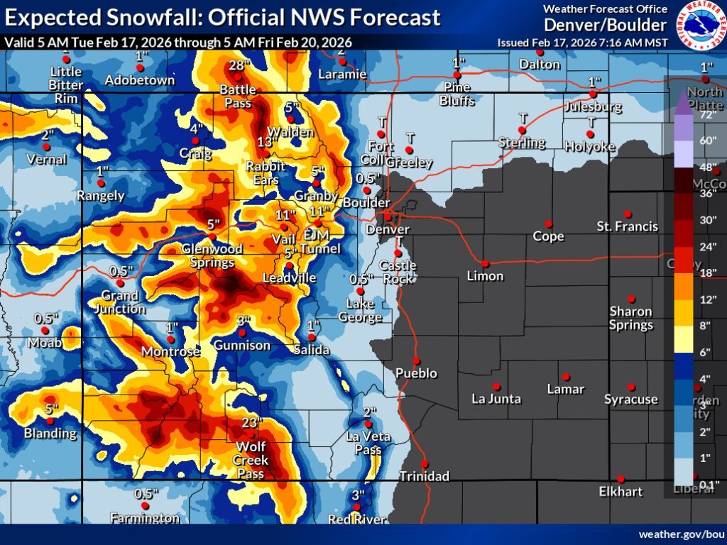 Many of Colorado’s mountains should see much more than that, though, with widespread totals between 18 inches and 36 inches expected. Favored areas will include Aspen, Steamboat Springs, and much of the San Juans, with most of the snow falling between Tuesday and Wednesday.
