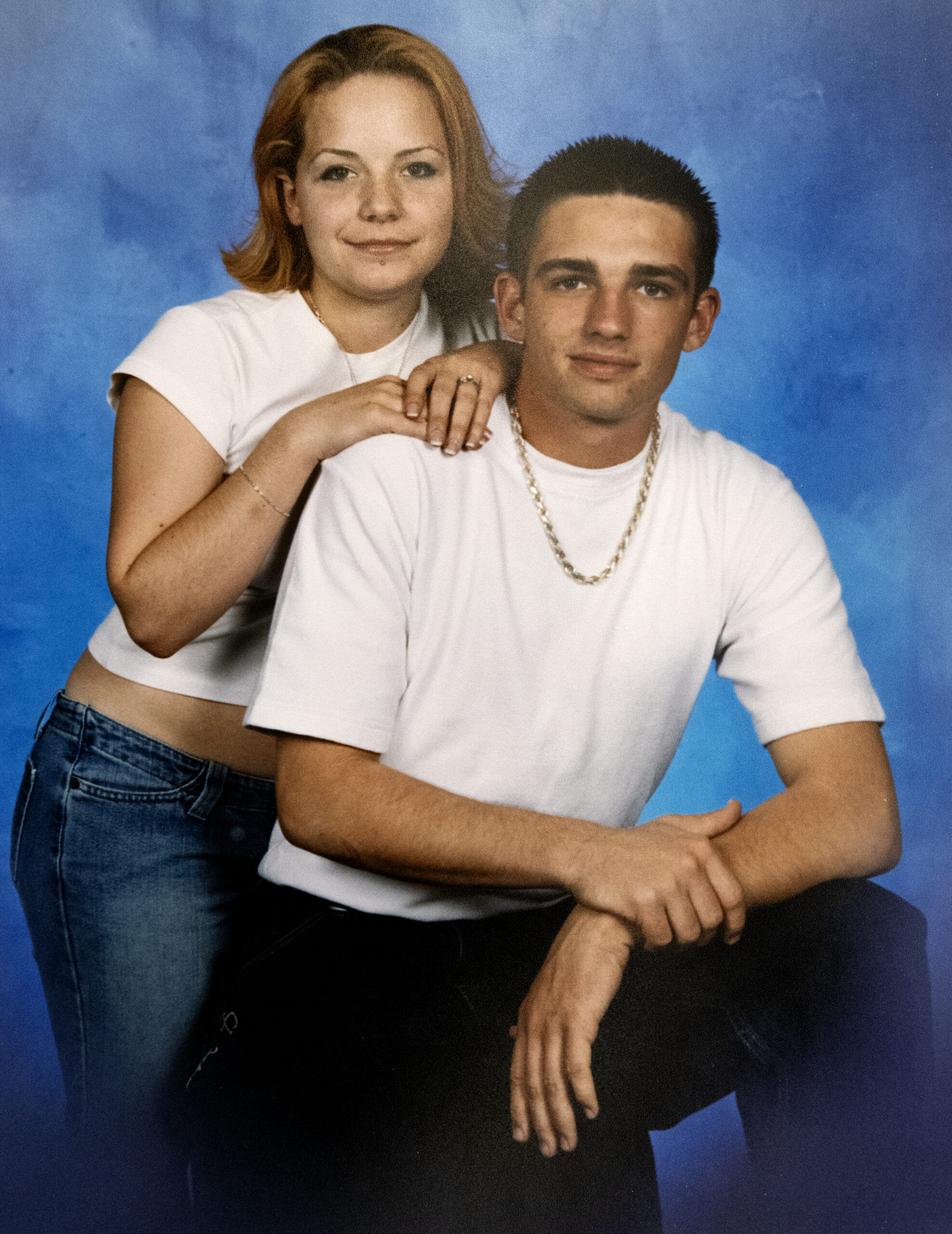 Her photos show a fun-seeking young couple. At their wedding, she is depicted beaming in a white tank top, with flaming-orange curly hair from a coloring mishap.