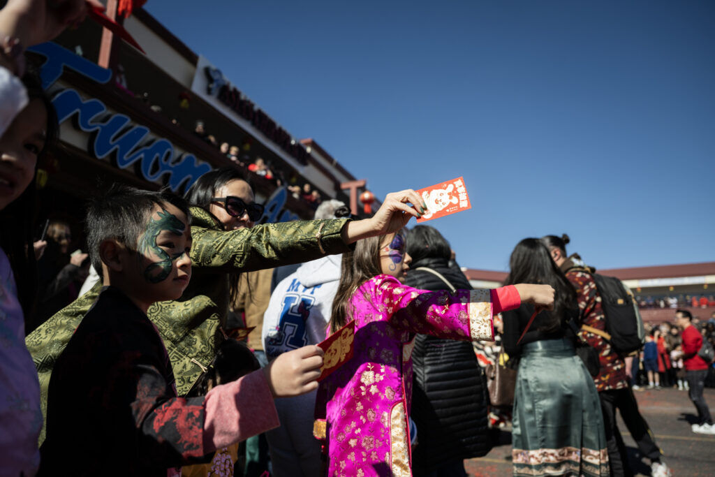 (Stephen Swofford, Denver Gazette)Kids hold out red envelopes with money in them to give to the Lions during a Lion Dance at the Far East Center’s Lunar New Year celebration on Saturday, Feb. 21, 2026. Giving away the red envelopes will bring good luck in the new year.