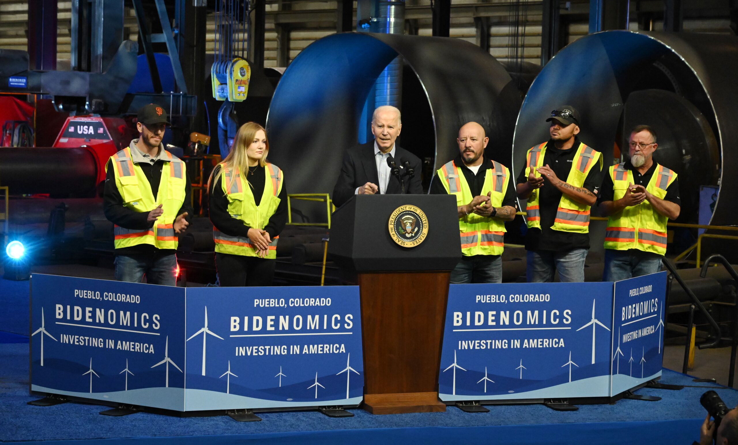 Jerilee Bennett, The Gazette President Joe Biden gives a few remarks after being given a tour of the CS Wind in Pueblo by employees on Wednesday, Nov. 29, 2023.