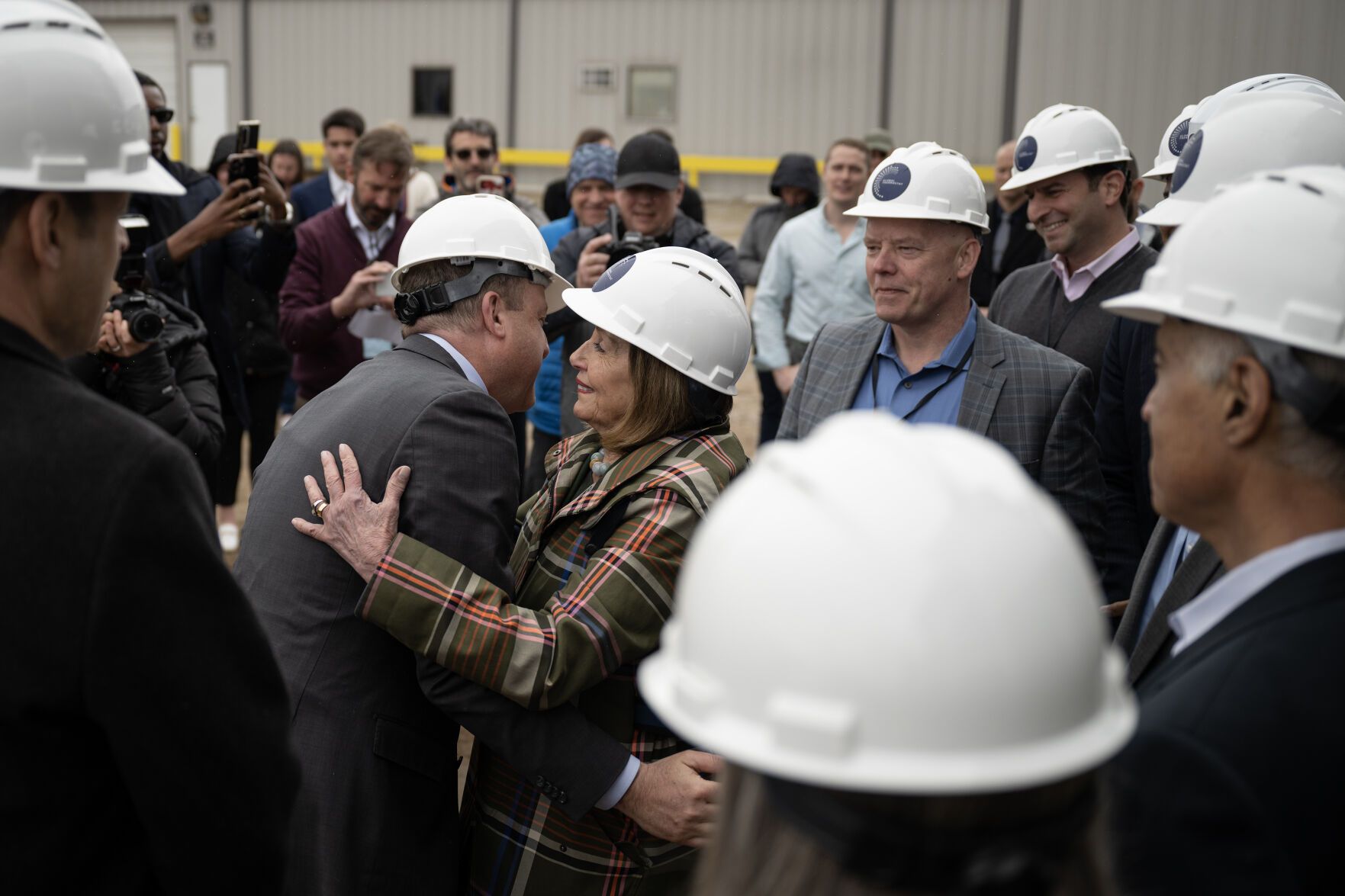 Speaker Emerita of the US House of Representatives Nancy Pelosi hugs Gov. Jared Polis after a ribbon cutting in front of the kiloton-scale unit used for removing carbon dioxide from the air on Tuesday, April 4, 2023 at Global Thermostat in Brighton, Colo. (Timothy Hurst/Denver Gazette)