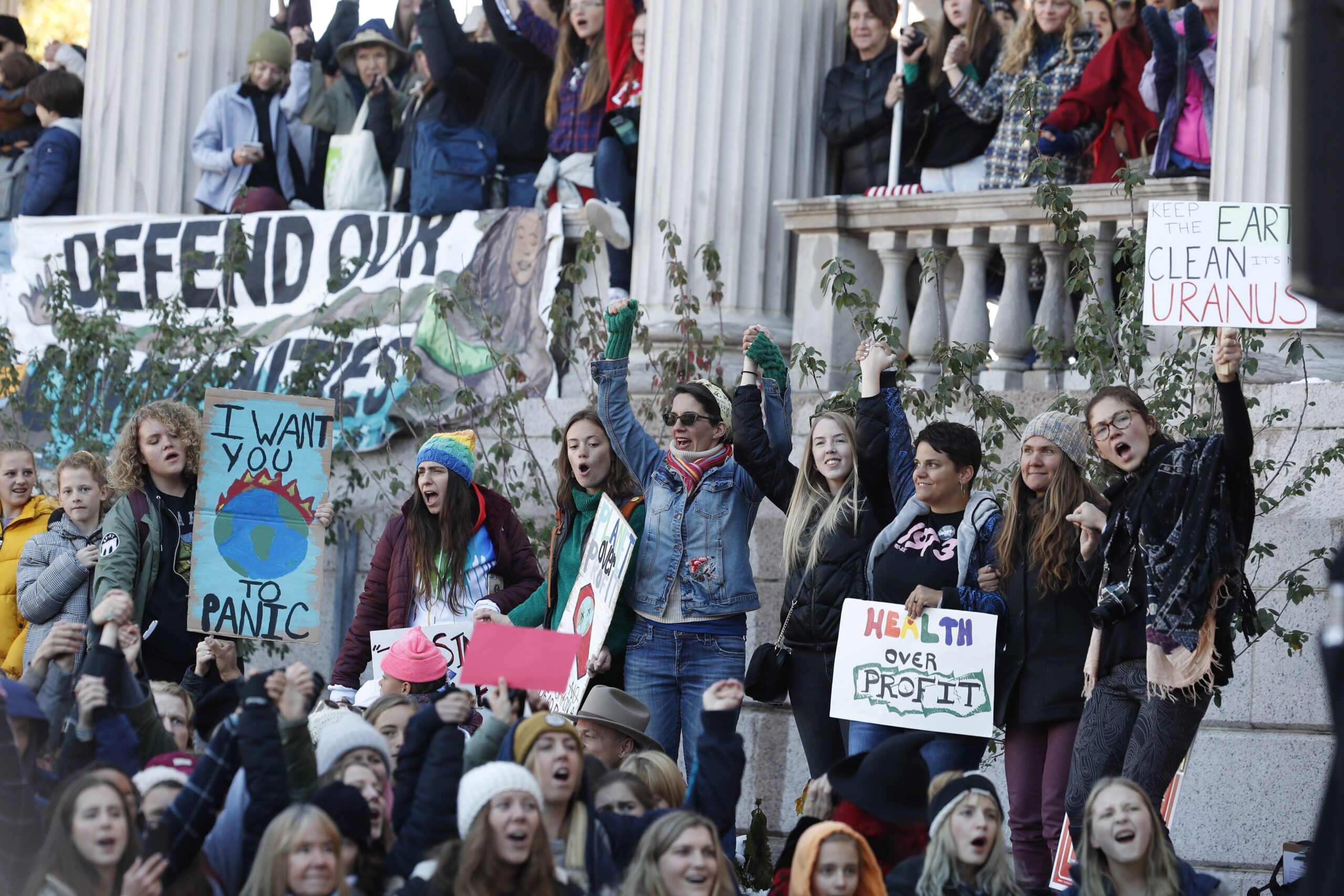 Attendees cheer as Swedish climate activist Greta Thunberg speaks to several thousand people at a climate strike rally Oct. 11 in Denver. (AP Photo/David Zalubowski)