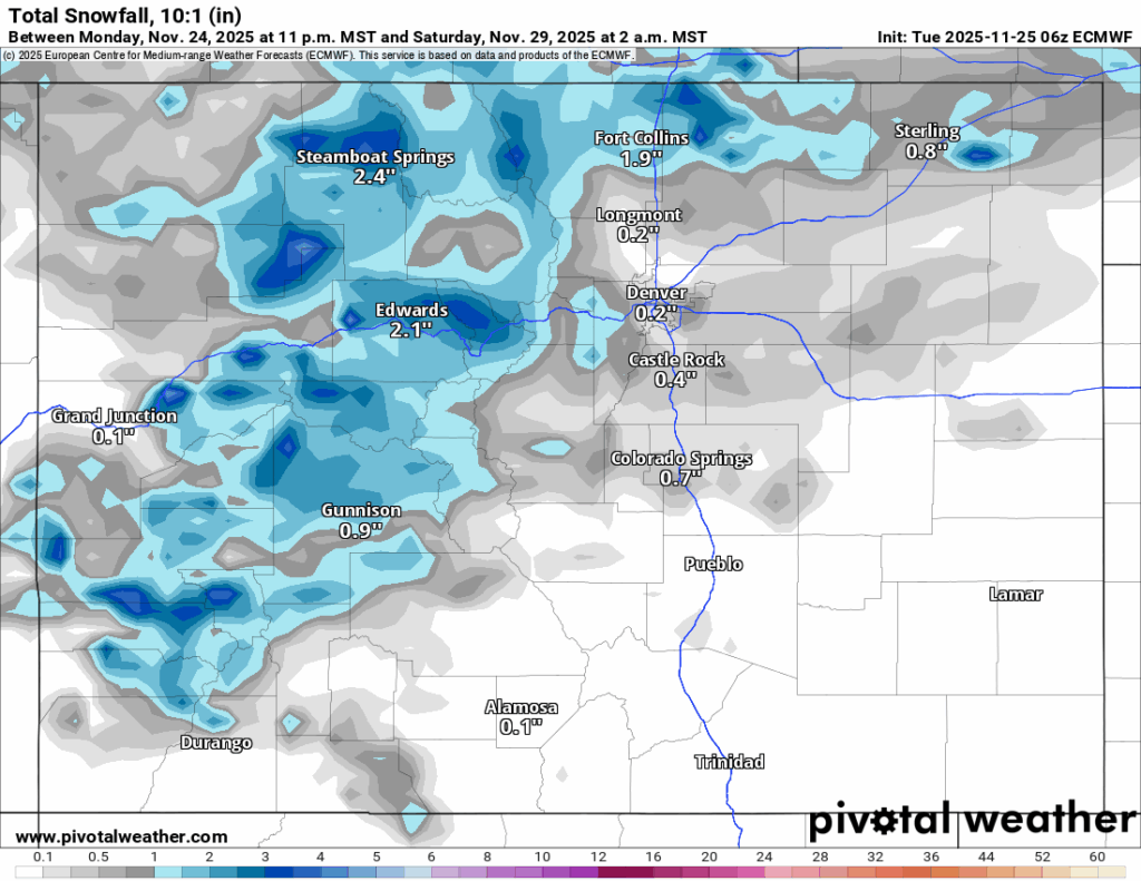 Forecast models still think snow is possible late Friday night into Saturday morning for metro Denver, potentially ending the streak of days without snow falling as well as the city’s first snow of the year.