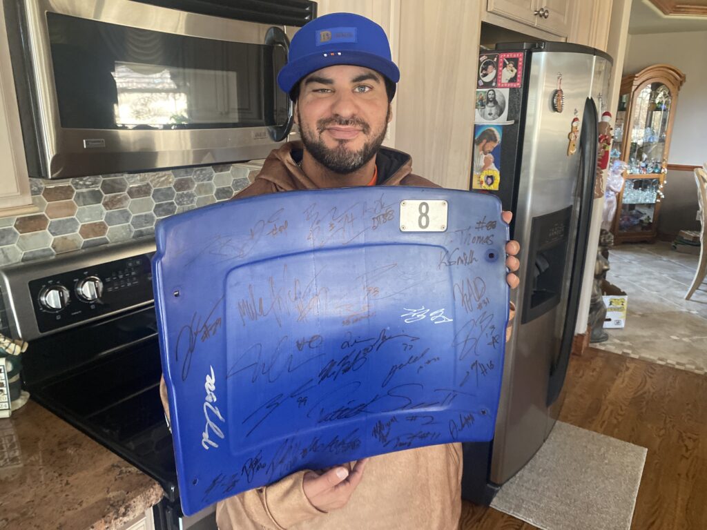 Cash has a large frame in his basement that includes five autographed photos of Meinerz. In 2023, he saw Meinerz when he was leaving Broncos Park. The star guard stopped and posed for photos while holding the big frame.