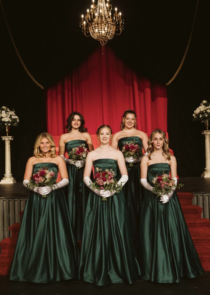 The Post Debutantes from 2024, wearing emerald green and carrying bouquets with a mix of red and pink roses, were Kate Virginia Bolio, daughter of Retired Army Col. Brian Bolio and Suzette Bolio; Chase Adaline Bradley, daughter of Retired Air Force MSgt. Karl Bradley and Retired Air Force MSgt. Julie Bradley; Emily Rose Briggs daughter of Robert Briggs III and Sandi Briggs; Anne Marie Dalsaso, daughter of Dr. Tom Dalsaso Jr. and Colleen Dalsaso; and Aleena Marie Khan, daughter of Dr. Khurram Khan and Dr. Tiffany Willard.