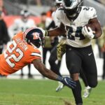 Former Alabama wide receiver and 2020 Heisman Trophy winner DeVonta Smith torched the Broncos on Sunday, totaling four receptions for 66 yards and two touchdowns. Smith’s first touchdown was over his former Alabama teammate and now Broncos rookie cornerback Pat Surtain II on a 34-yarder. And the second was on a 5-yard pass from quarterback Jalen Hurts.