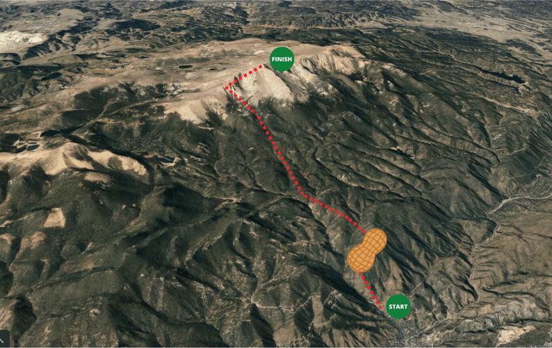 A man attempting to push a peanut to Pikes Peak’s summit with his nose has about 10 miles to go to reach his goal, according to a tracker on the city of Manitou Springs’ website.