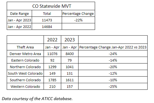 The Colorado Auto Theft Prevention Authority (CATPA) report for the first four months of the year showed that 22% fewer cars were stolen from January through April, compared to the same period in 2022.