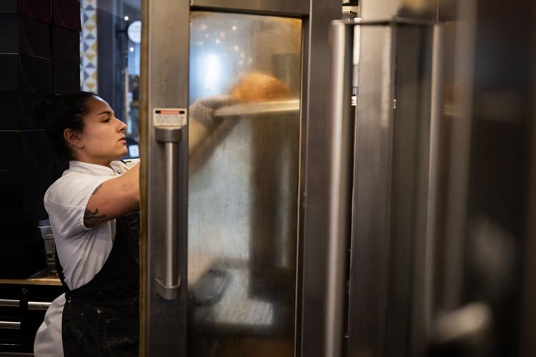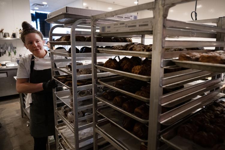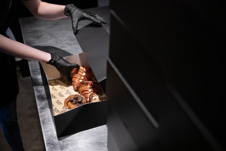 Marcio Paulucci tops off a tray of Raspberry Cheesecake Cruffins on Friday, Sept. 1, 2023, at Black Box Bakery in Edgewater, Colo. (Timothy Hurst/Denver Gazette)
