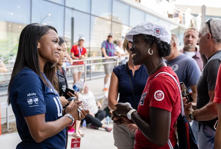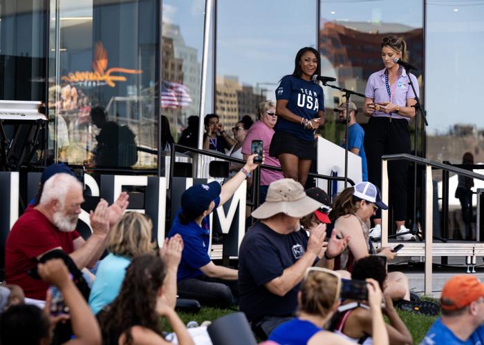 Former Team USA Olympic gymnast Dominique Dawes speaks to a crowd during Downtown Summer Fest at the U.S. Olympic and Paralympic Museum on Saturday, July 27, 2024, in Colorado Springs, Colo. Dawes is the last American female gymnast to compete in three Olympic Games before Biles matches the feat in Paris. (Parker Seibold, The Gazette)