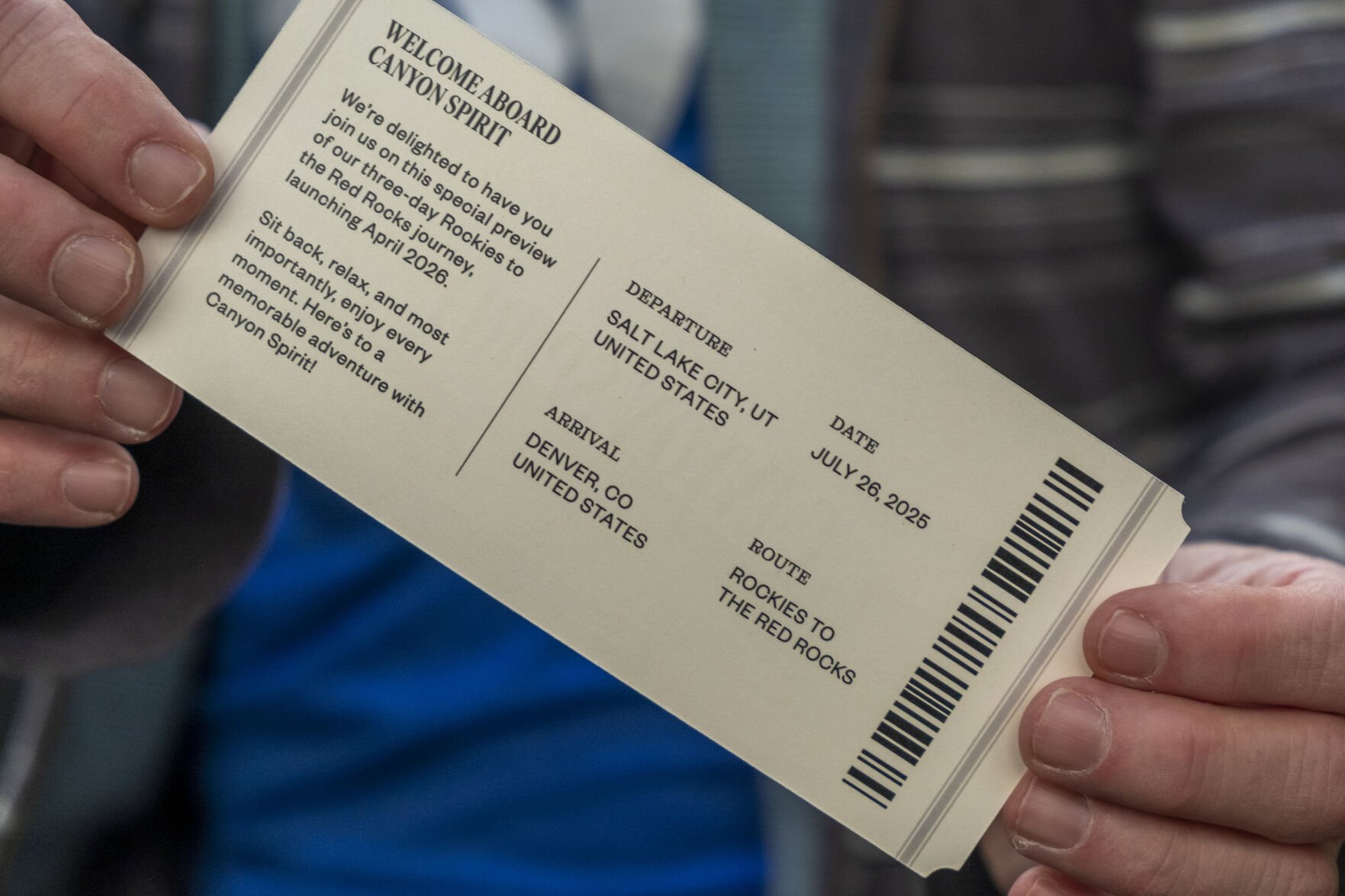 Australian Steve Madgwick holds up a promotion ticket to the Canyon Spirit luxury train ride from Salt Lake City, Utah to Denver, Colorado Saturday, July 26, 2025 in Salt Lake City, Utah. The train ride known as "Rockies to the Red Rocks" is expanding in April 2026 to include a third day of travel between Moab, Utah and Salt Lake City.