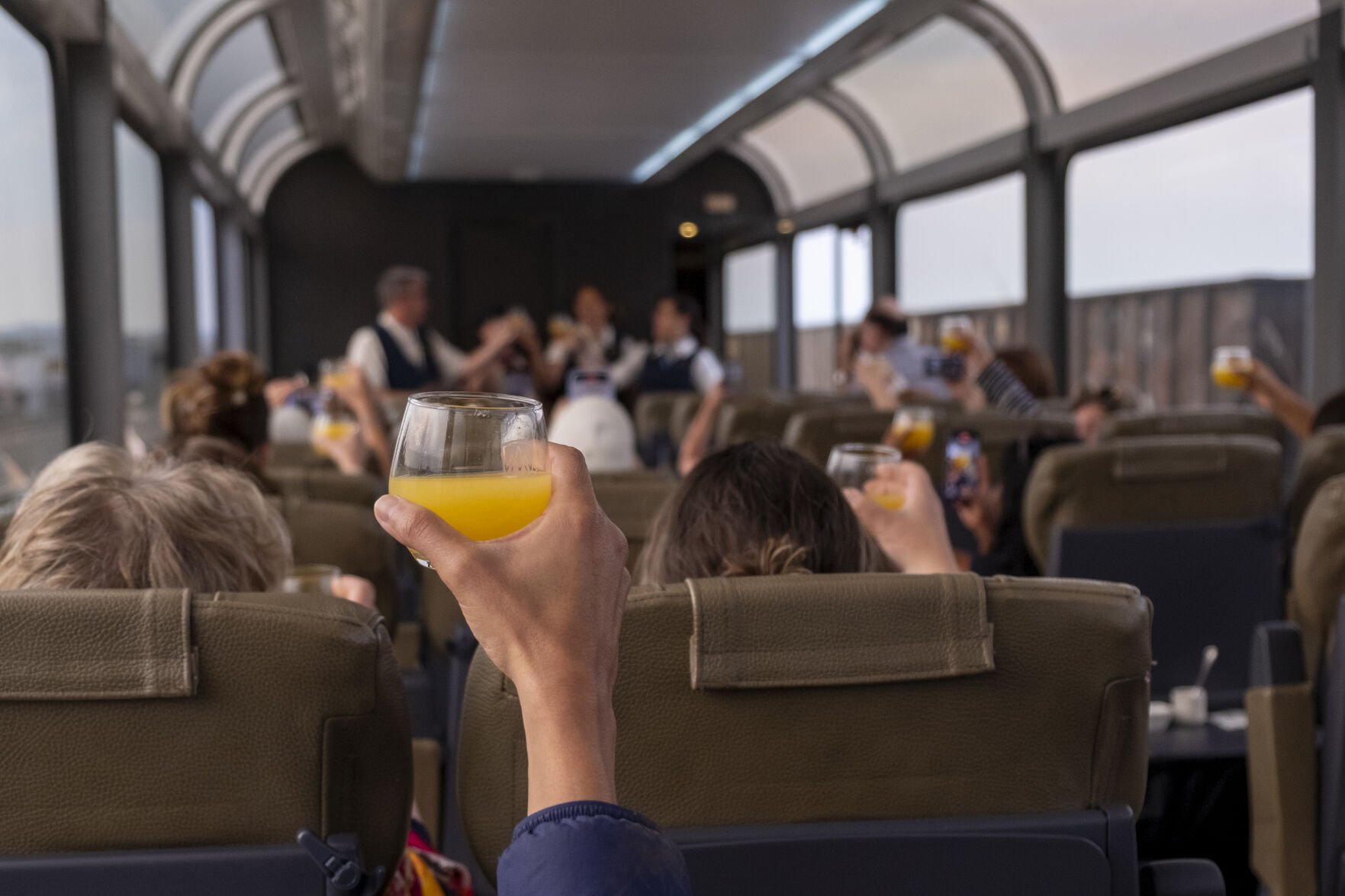 Akash Arora holds up a mimosa during a bon voyage toast as the Canyon Spirit train departs from Salt Lake City, Utah on Saturday, July 26, 2025. The 3-day, daytime-travel only trip will be offered between Salt Lake City and Denver, Colorado starting in April 2026.