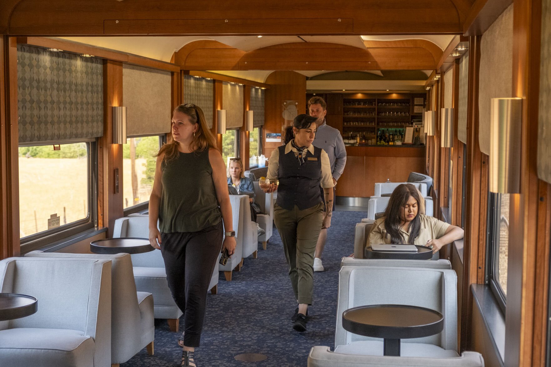 Lauren Roddy, left, walks in the lounge car, along with Leigh Berry and Ed Elliot as Susmita Baral sits during a media preview train trip aboard the Canyon Spirit Saturday, July 26, 2025 from Salt Lake City, Utah to Denver, Colorado.