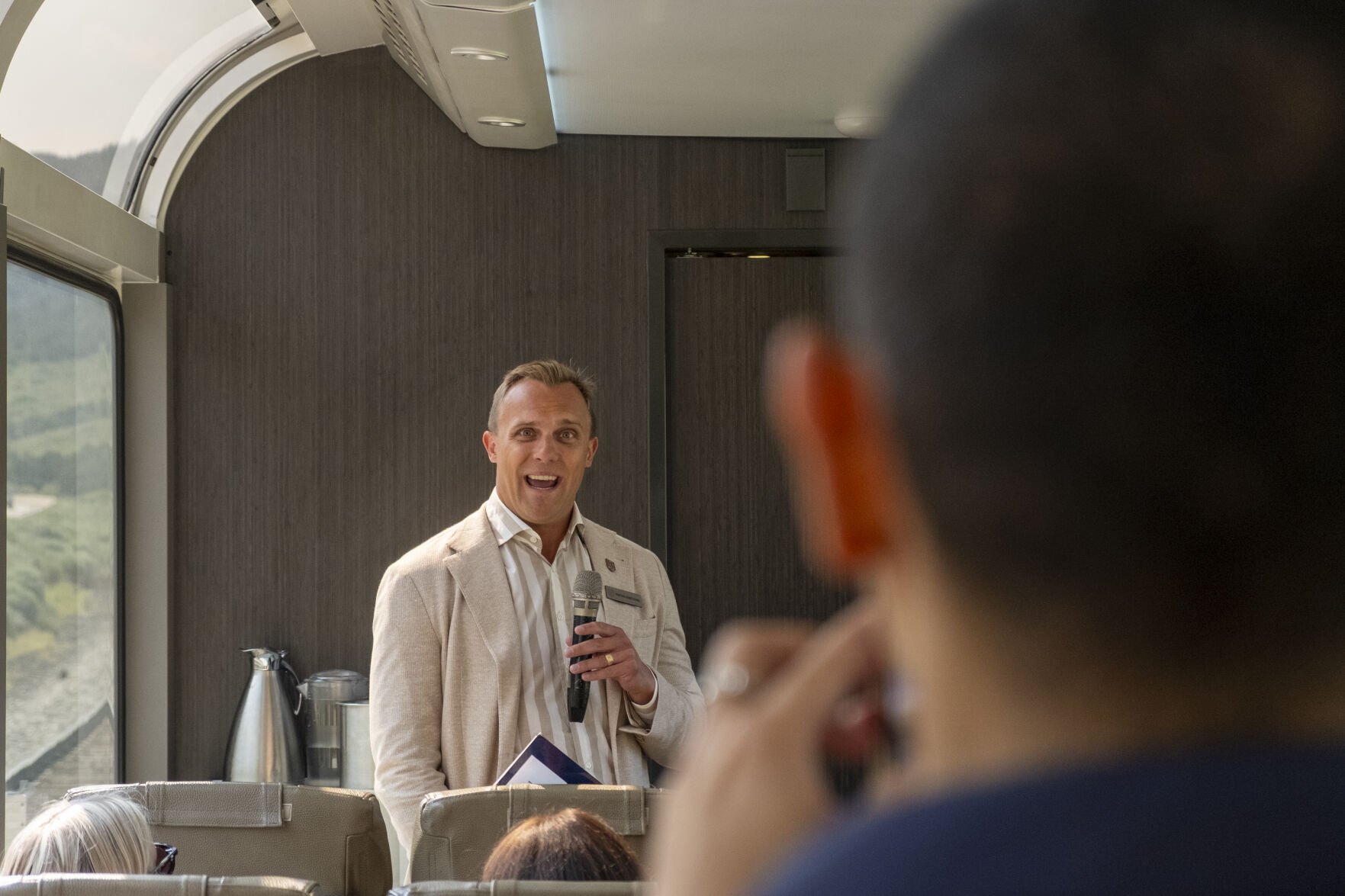Ed Elliot talks to other guests on a Canyon Spirit train ride between Salt Lake City, Utah and Denver, Colorado Monday, July 28, 2025. The "Rockies to the Red Rocks" train ride offered by Armstrong Collective is a 2- or 3-day, daytime travel only train ride that expands the current train ride from Denver to Moab, Utah, which will bring an extension to Salt Lake City from Moab starting in April 2026.