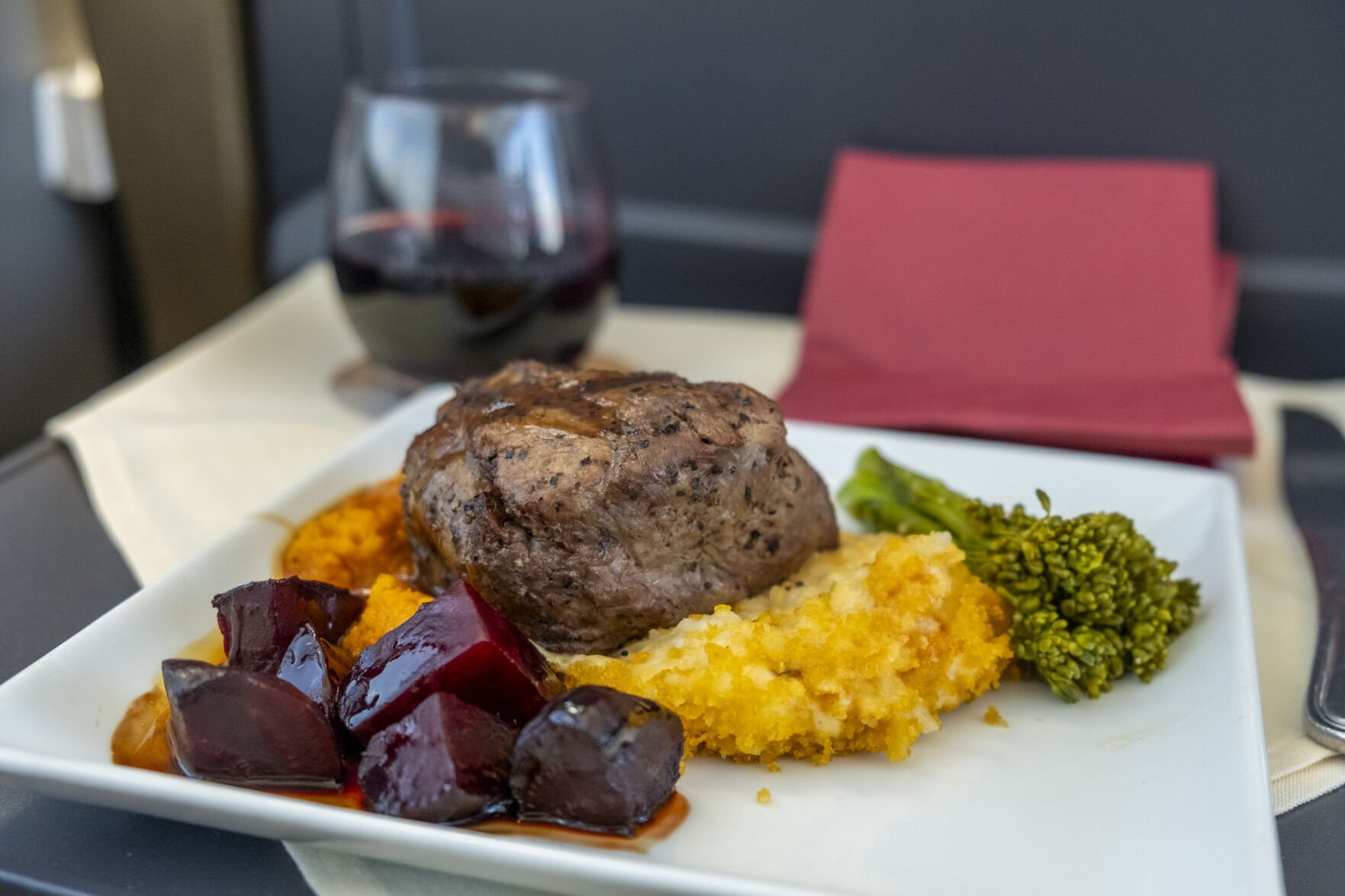 Seared beef tenderloin with celebration potatoes, brown butter carrot puree and balsamic glazed purple beets was one lunch option during a media preview train ride on the Canyon Spirit Saturday, July 26, 2025 from Salt Lake City, Utah to Denver, Colorado.