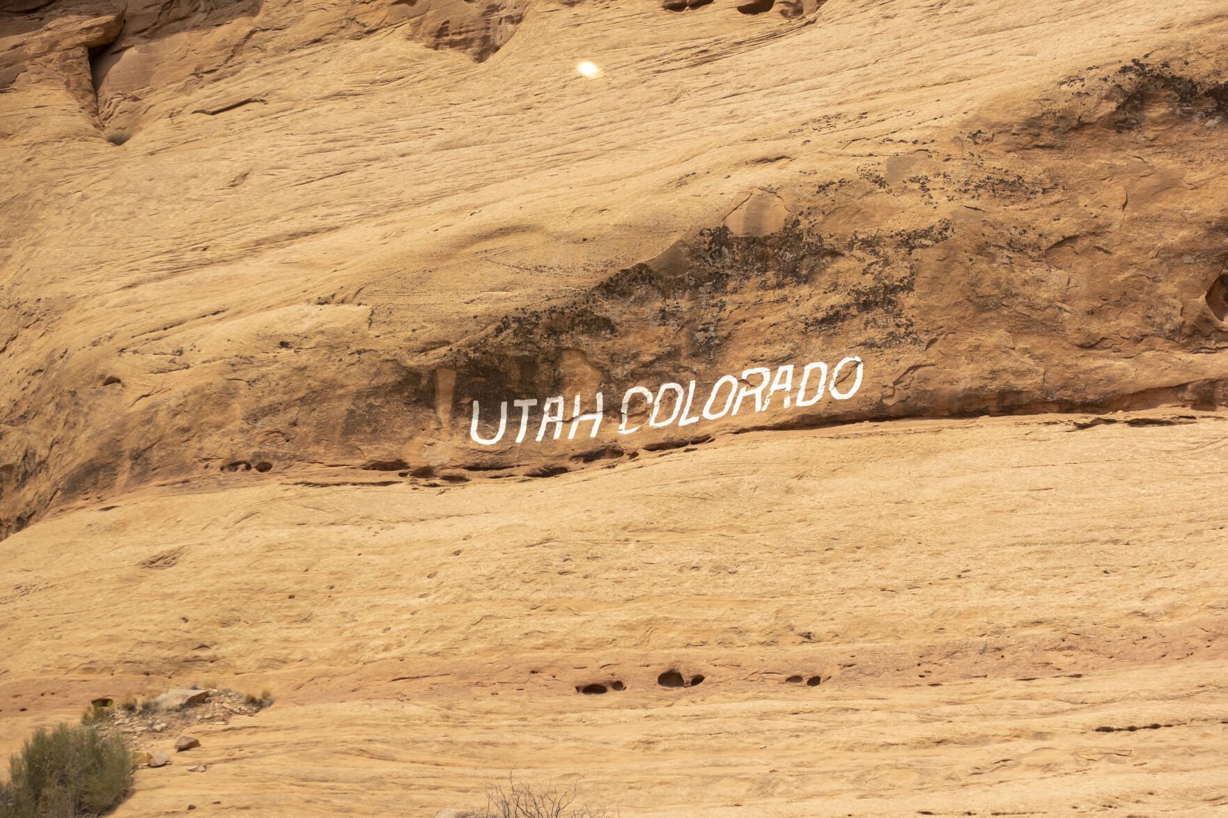 A rock formation shows where the Utah and Colorado state line is north of Fruita, Colorado, as seen here from the Canyon Spirit luxury train ride Sunday, July 27, 2025.