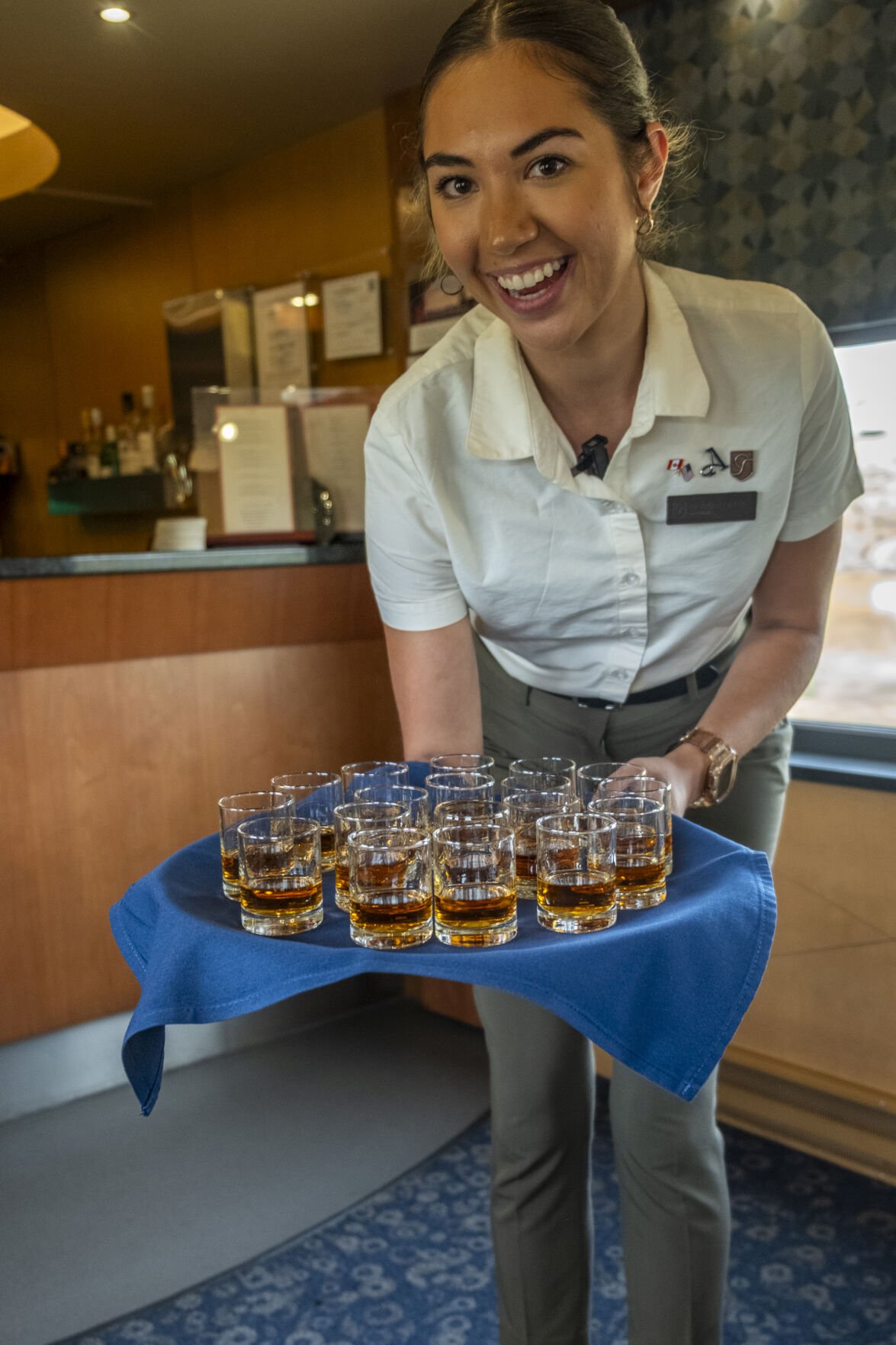 Onboard host Olivia Lopez presents a serving tray of bourbon whiskey while Canyon Spirit luxury train guests sample four different bourbons and whiskeys Monday, July 29, 2025 on a train ride between Salt Lake City, Utah and Denver, Colorado.