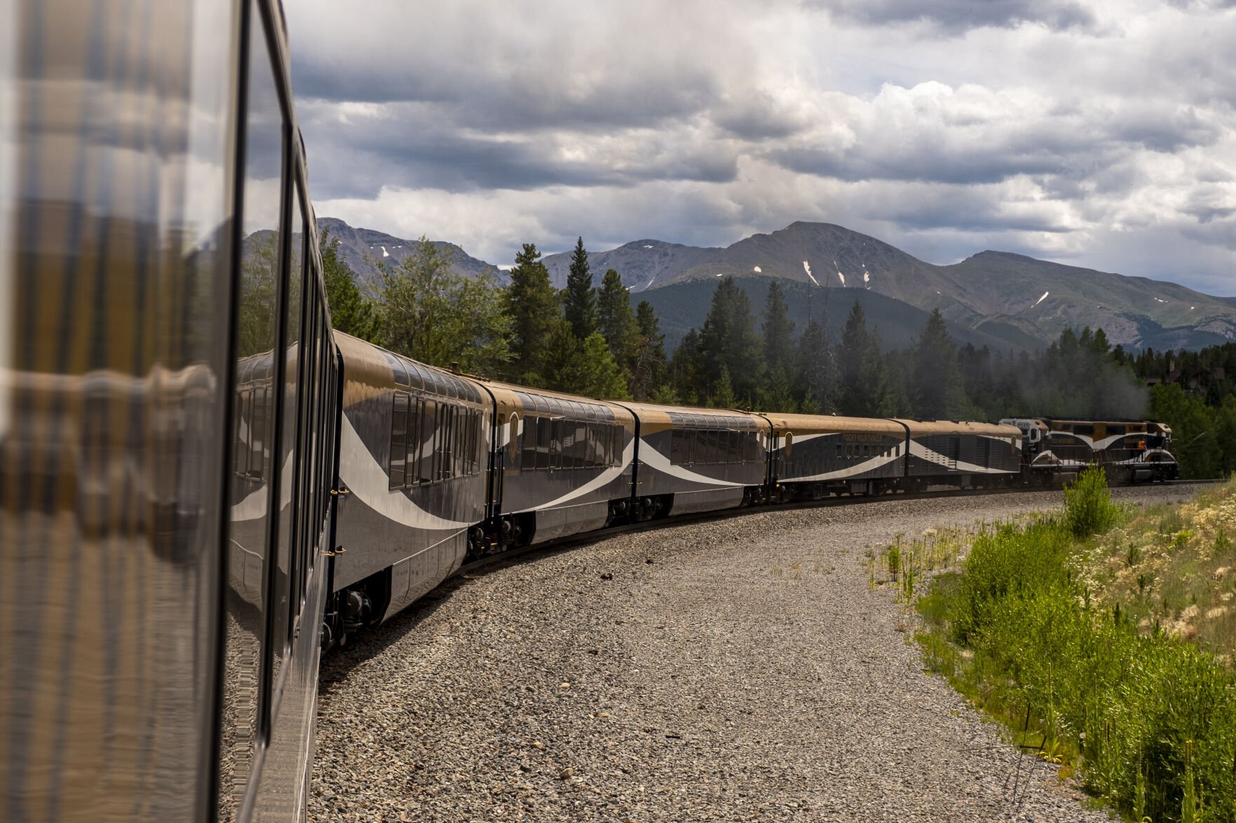 A Canyon Spirit train presses forward through Winter Park, Colorado with Parry Peak in the background Monday, July 28, 2025 on a train ride from Salt Lake City, Utah to Denver, Colorado.