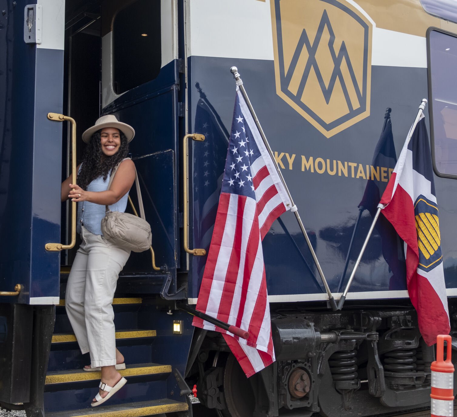 Zineb Baaout stands on the stairs of train car 2015 and poses for a picture Saturday, July 26, 2025 ahead of departure for a media preview train ride from Salt Lake City, Utah to Denver, Colorado. The Armstrong Collective is adding an extension to Salt Lake in April 2026 to the already running 'Rockies to the Red Rocks' luxury train ride from Denver to Moab, Utah.