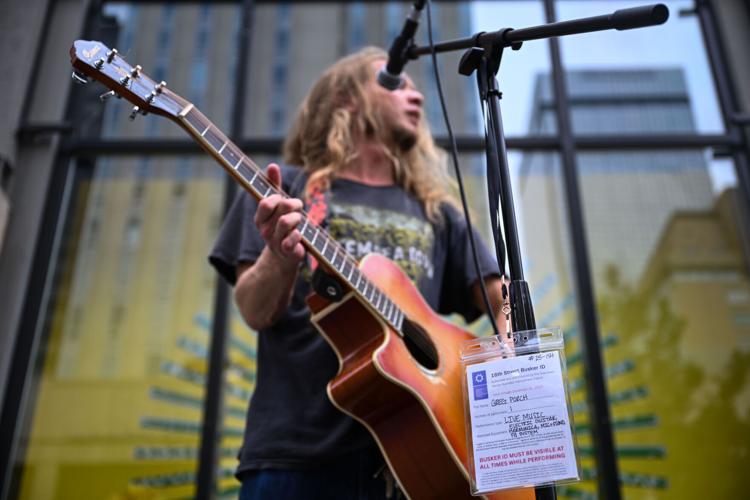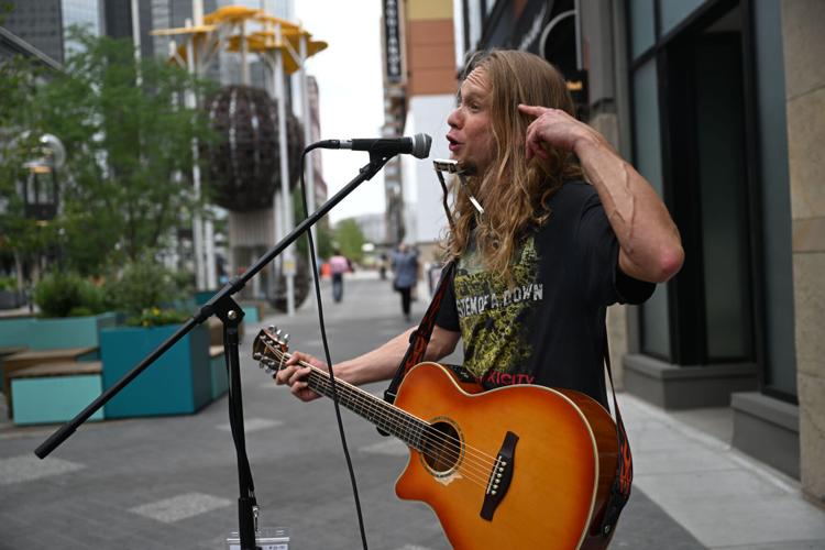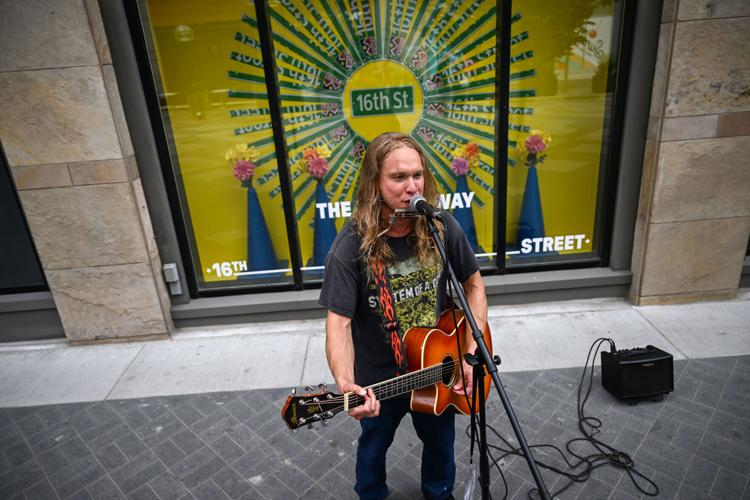 Greg Porch busks on 16th street on Tuesday, July 29, 2025. (Stephen Swofford, Denver Gazette)
