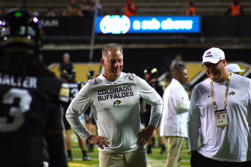 Colorado offensive coordinator Pat Shurmur, center, and offensive line coach Gunnar White, right, look on during pregame warmups vs. Wyoming on Saturday, Sept. 20, 2025 at Folsom Field in Boulder.