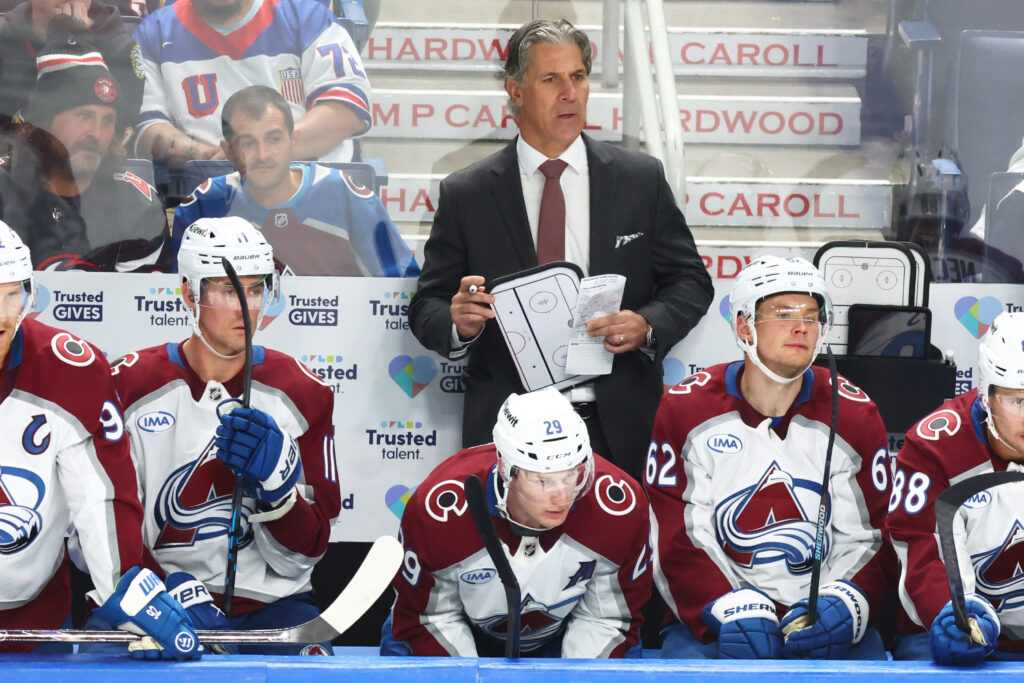 Colorado Avalanche head coach Jared Bednar, center top, looks on during the third period of an NHL hockey game against the Buffalo Sabres, Monday, Oct. 13, 2025, in Buffalo, N.Y. (AP Photo/Jeffrey T. Barnes)