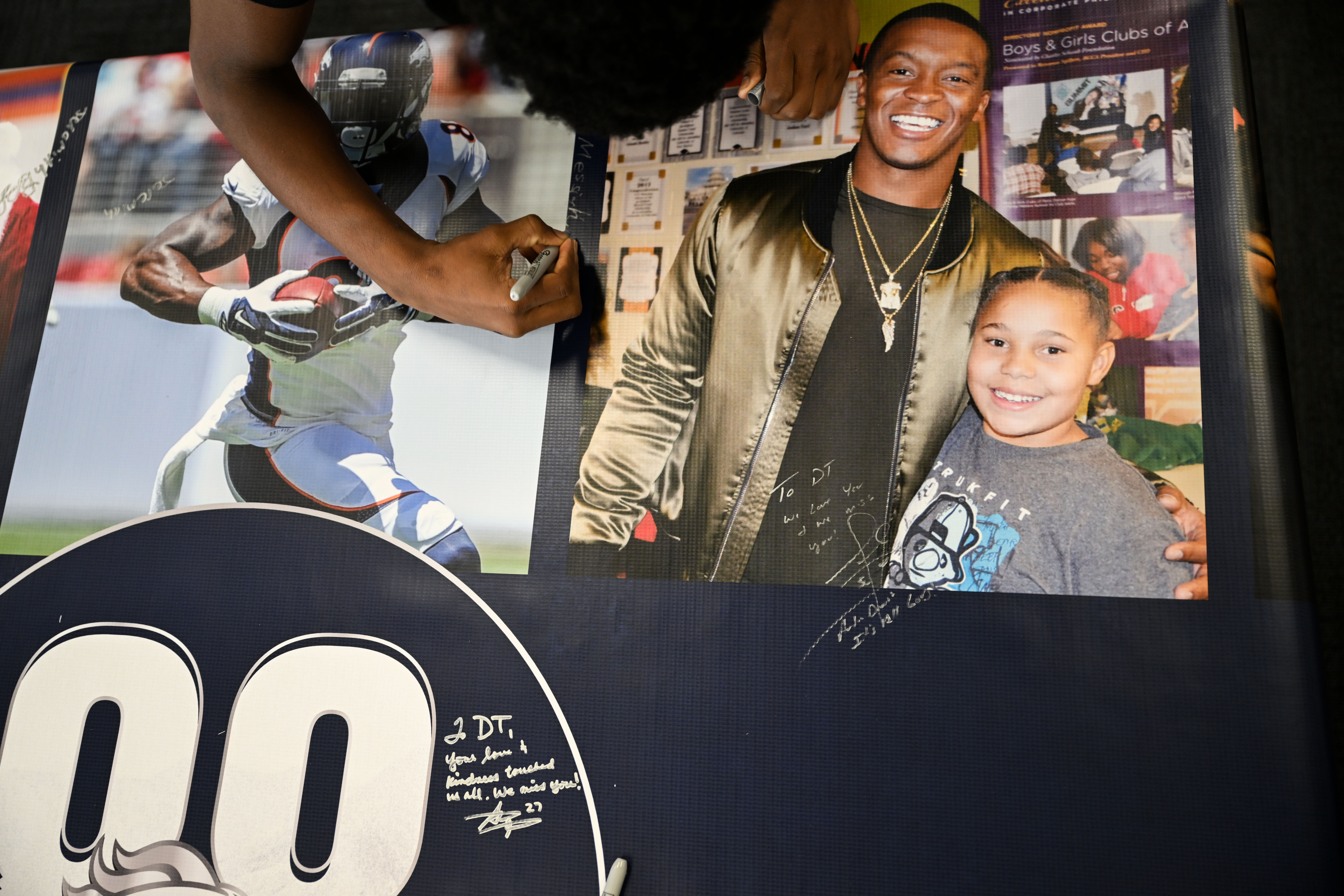 About a dozen Broncos’ alumni — including Steve Atwater (1989-98), David Bruton (2009-15), Nick Ferguson (2003-07) and Randy Gradishar (1974-83) — gathered for an afternoon of activities with the kids. They led flag football drills. They played soccer and basketball. Kids signed a giant banner with photos of Thomas at the Boys and Girls Club throughout the years.