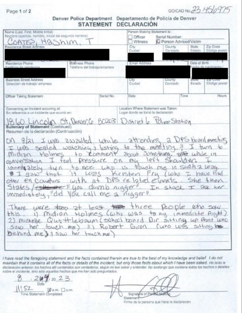 Fry’s lawsuit alleges that Coates, Shofner and the others retaliated and conspired to accuse her of “a hate crime assault during a public school board meeting and pursuing criminal charges against her for months, only stopping when late-disclosed video evidence proved their claims were demonstrably false.”