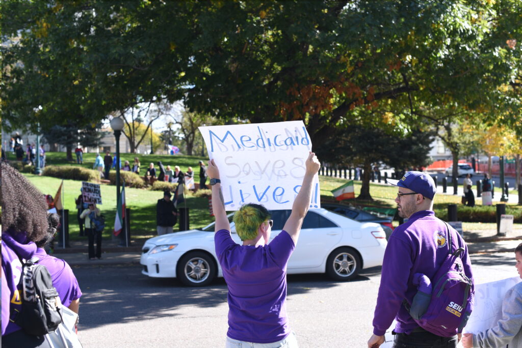 Among those in attendance were members of the Service Employees International Union Colorado, wearing purple shirts with the union’s logo splashed on the front and back. Jerod Truss, a nurse at a Kaiser Permanente medical center and member of the union, said that members were there to protest what he said was Trump’s attack on union rights.