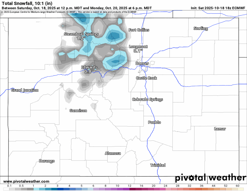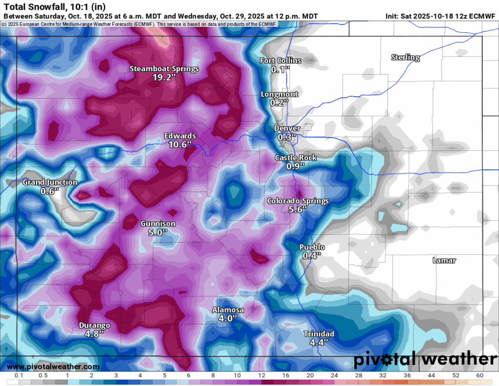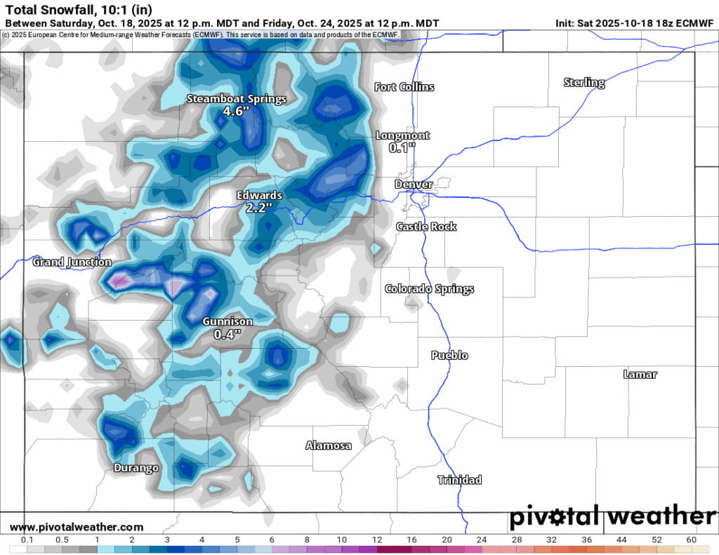 According to ECMWF modeling, from Saturday to Tuesday, Oct. 28 evening, snow showers will produce moderate to heavy snowfall for Colorado’s high country, with the potential for snow as low as 5,500 feet in the Front Range foothills, along the Palmer Divide and south to the New Mexico state line.