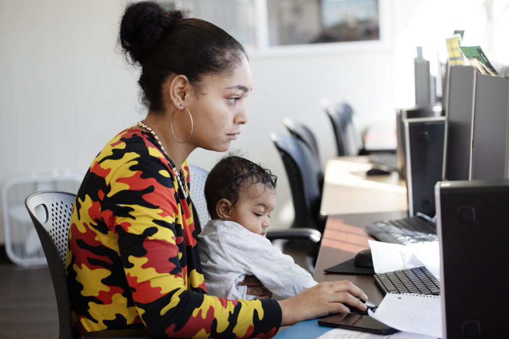 Williams comes to Chambers Plaza Library several times a week to work and has developed trusting relationships with staff members, who will often watch her kids while she works.