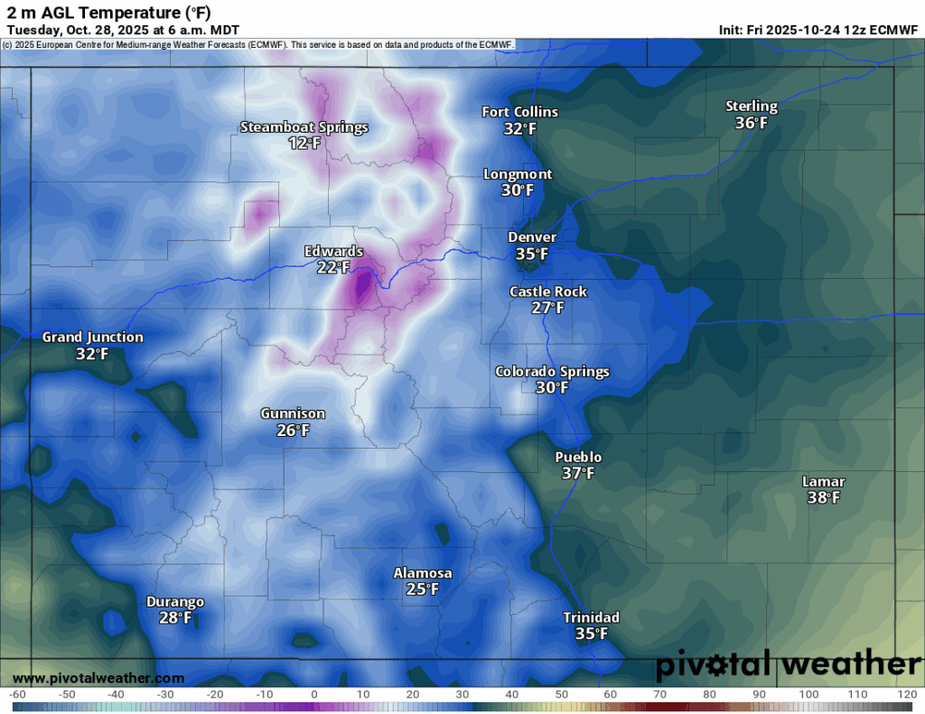 Wednesday morning’s forecasted low temperatures are similar, however, more widespread across the entire state, which could lead to additional snowmaking during the first several days of next week.