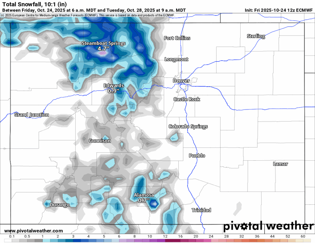 Starting Sunday evening, the ECMWF forecast model run from Friday afternoon forecasts snow returning to Colorado, this time like previous forecasts, mostly for the northern mountains.