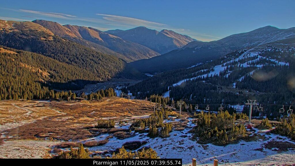 South facing slopes have little to no snow and north facing slopes have snow more or less only in shaded areas, as evident from Loveland Ski Area’s Ptarmigan web camera.