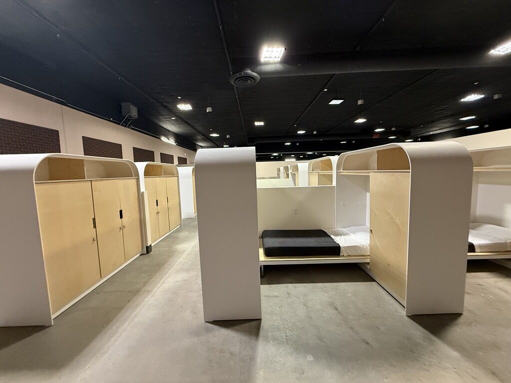 In Tier Two, there are designated rooms set aside with 114 individual pod-style living accommodations. The pods are more private than the cots in tier one and include a bed and private storage space. The second tier serves as a “bridge between emergency shelter and fully independent living,” officials said.
