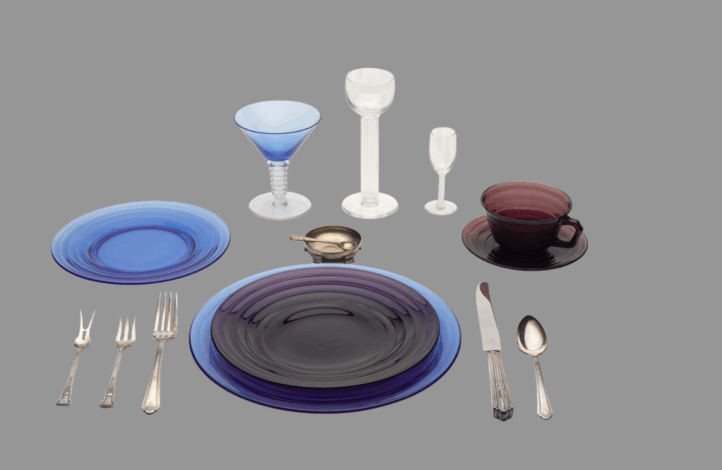 “Table settings can tell us a lot about the time period in which they were designed. For example, during the Art Deco era there were a lot more specialized pieces on a table. We had specific glasses for specific drinks and individual salt cellars with little spoons for each guest. During this era, we do see more salt and pepper shakers coming out so the cellar was becoming less common and would become obsolete in later years,” said Goodrum.