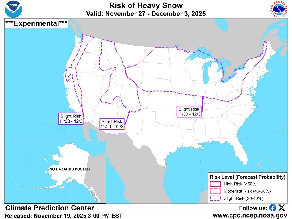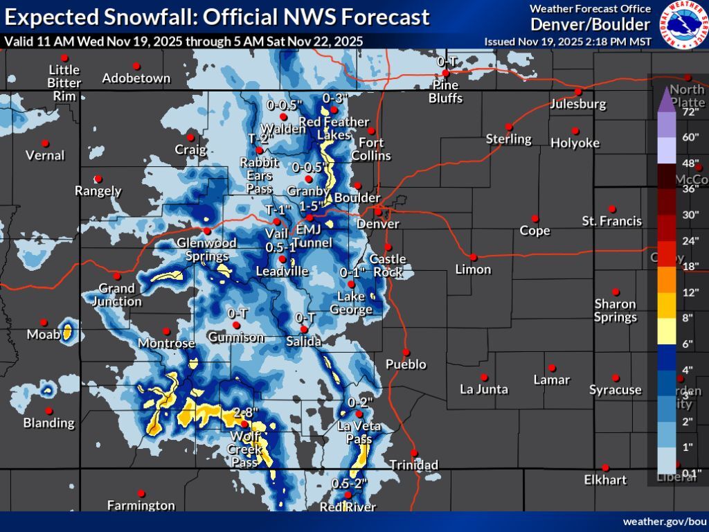 Looking ahead into next week, more snow is possible. It’s also worth noting that much of Colorado is included on the ‘risk of heavy snow’ map that’s produced by the National Weather Service for dates of November 29 through December 3.